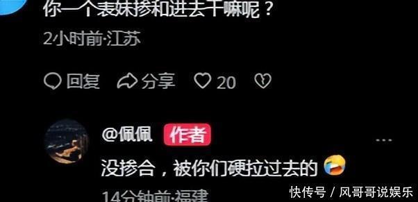 而佩佩在见到网友们这样说,她也是直接回应,表明自己并没有参与瑾汐家事,是被网友们硬说拉进这个事情的,从这句话也可以看出佩佩的无奈。